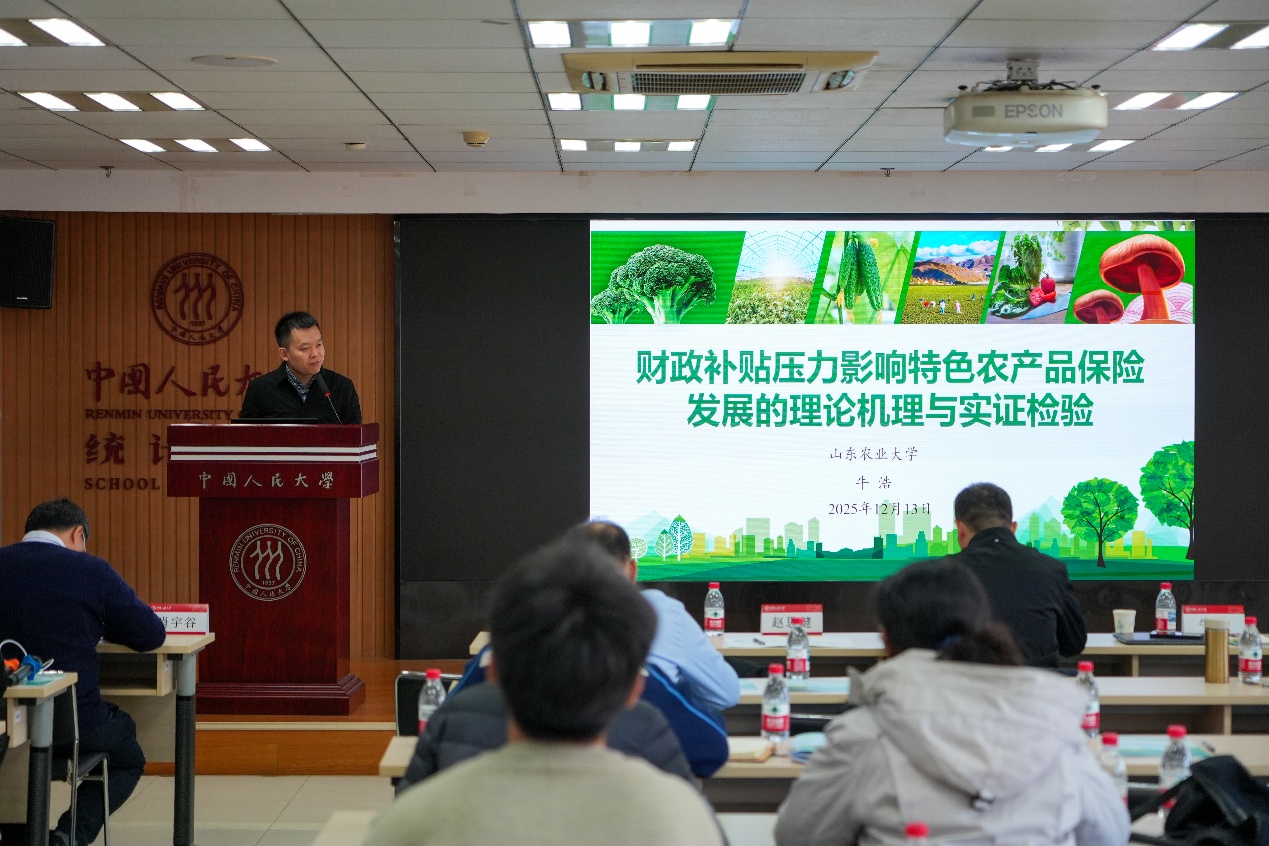 牛浩报告题目为“财政补贴压力与特色农产品保险发展的理论机理与实证检验”。报告指出特色农产品保险顶层设计不断完善,特色农业经济地位凸显,但存在保险发展显著落后于产业规模的问题,包括覆盖率与保障度失衡、高运营成本下供给不足、产品设计与风控短板、农户投保意愿不足。报告指出,财政补贴压力会显著抑制特色农产品保险发展并通过两条路径传导,一是预算编制原则挤压保险政策空间,二是补贴激励不足弱化市场资源配置效率。报告最后提出建议,如何在财政压力既定下优化补贴资金。第一阶段优化存量,基于跟踪分析识别可降低补贴比例与产品费率险种,释放资金空间;第二阶段精准增品,将结余资金优先保障潜力险种,提升资金效能。
