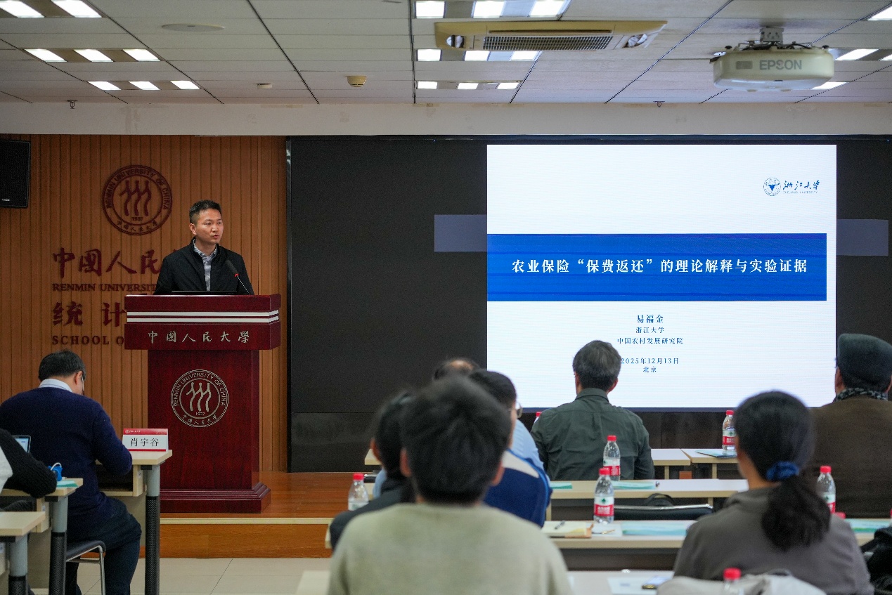 易福金报告题目为“农业保险‘保费返还’的理论解释与实验证据”。报告提出农业保险理赔存在赔不准,包括赔付标准不明、赔付金额低于预期、拒赔的问题,认为农业保险可以视为包含受灾后赔付不确定性的复合风险结构,指出保费返还是赔不准的解决方案。研究结果显示,赔付不确定性显著降低农户支付意愿,而保费返还作为溢价补偿形式能够削弱该负向影响,激励农户购买农险。报告最后提出两大建议,一是短期做好规范与过渡,从制度上承认保费返还的阶段合理性并制定规范约束保费返还比例,推动农险基础数据的开放与共享;二是长期推动科技应用与规模扩大,积极推动大数据、遥感科技与农险的深度融合,稳步推动农业规模化经营。